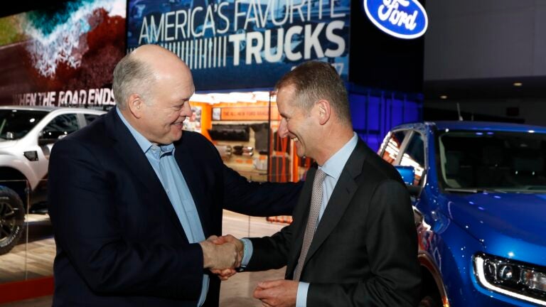 Volkswagen CEO Herbert Diess and Ford CEO Jim Hackett said Tuesday that the first jointly developed vehicles could hit the market as early as 2022 and that the linkup would offer efficiencies that would mean stronger profits starting in 2023.