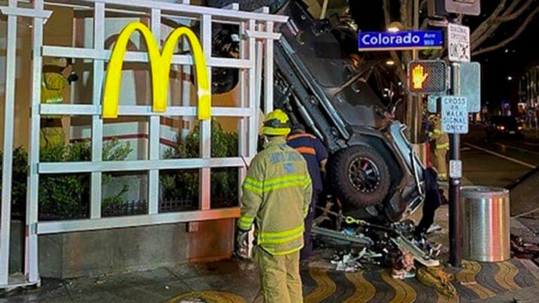 When officers arrived shortly after midnight, they found the destroyed vehicle up against a McDonald’s restaurant across the street from the garage in Santa Monica, police said.