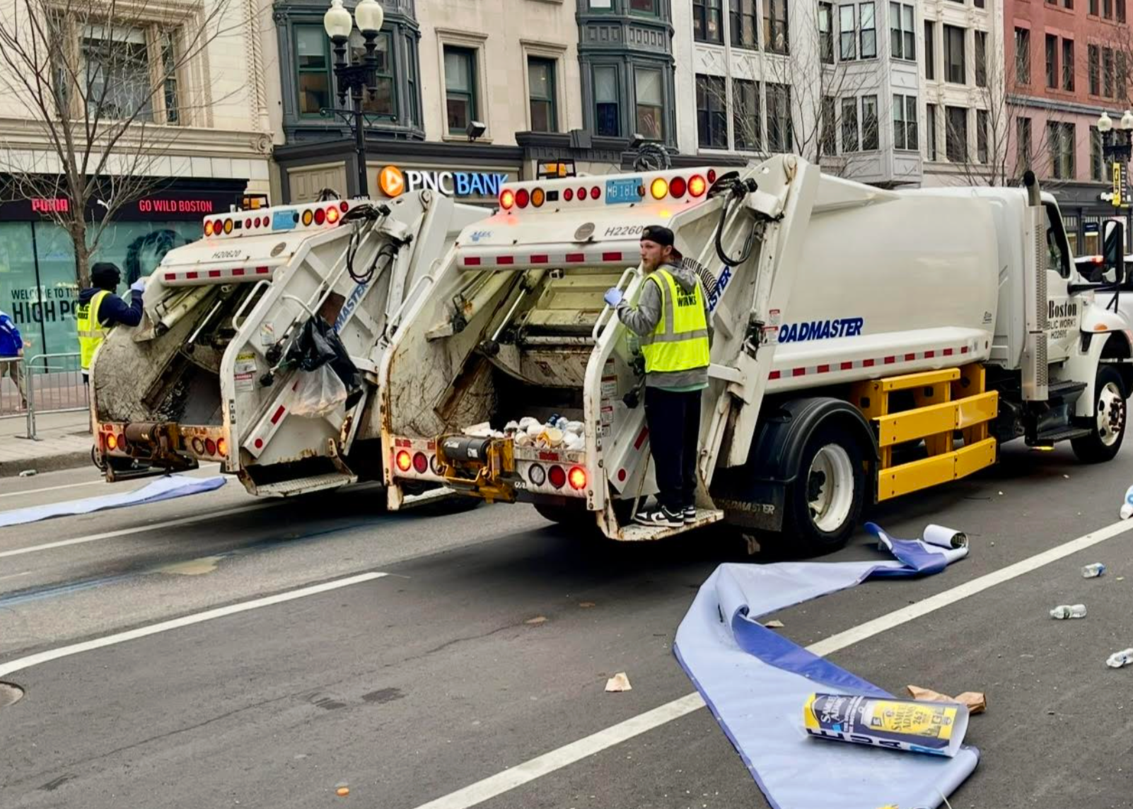 Boston Public Works begins cleanup about six hours after the race starts, moving in behind runners and reopening roads in stages.