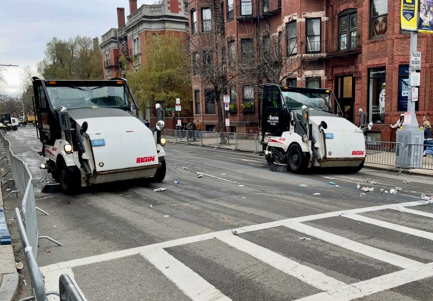 To get there, crews rely on street sweepers, leaf blowers, and manual tools like brooms and shovels. A typical Boston Marathon deployment includes 10 to 13 street sweepers and a dozen sanitation trucks.