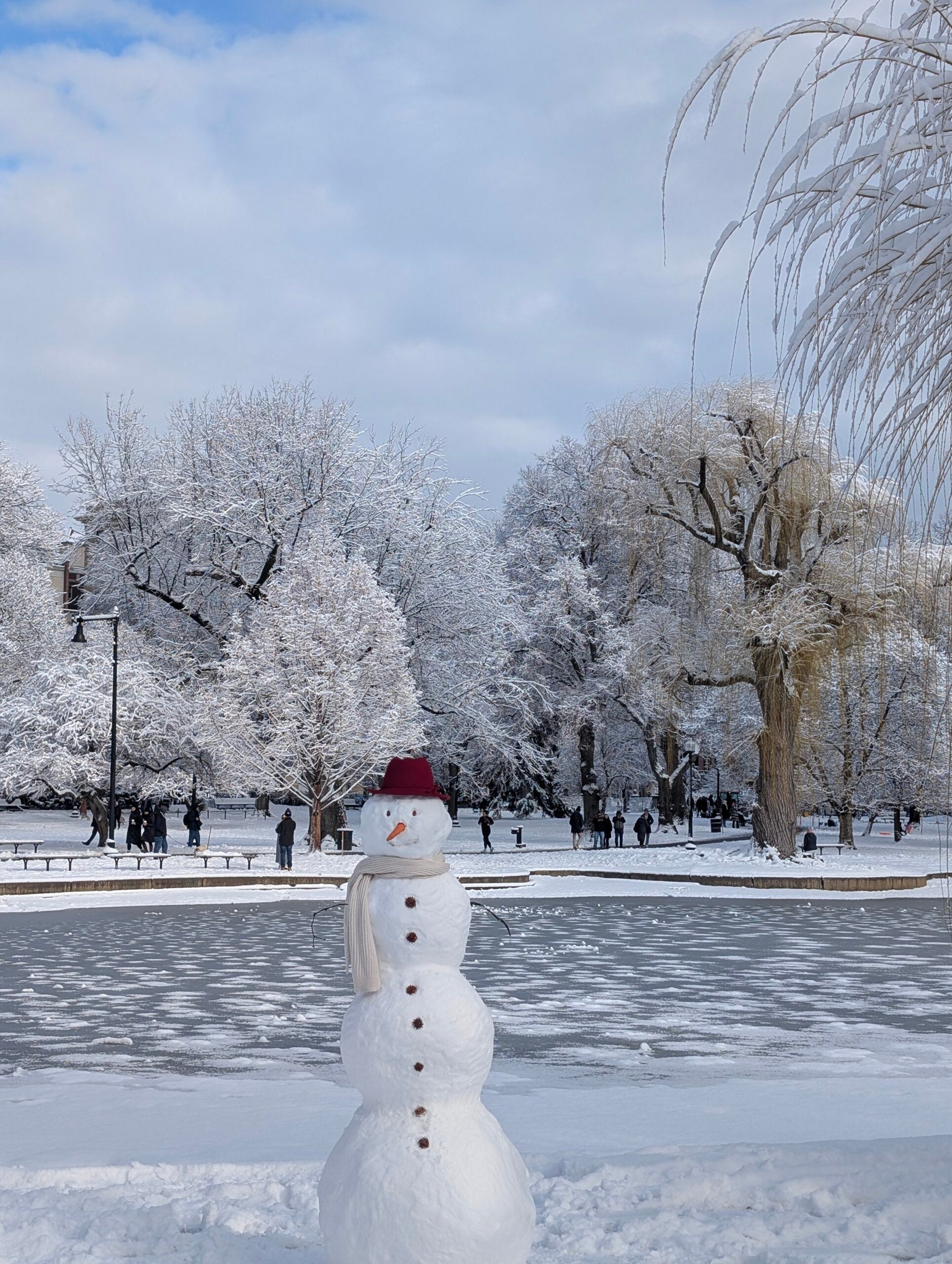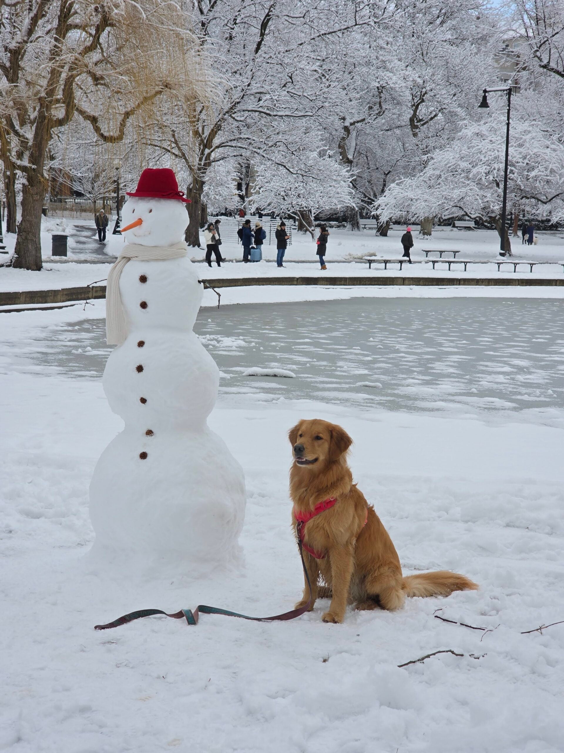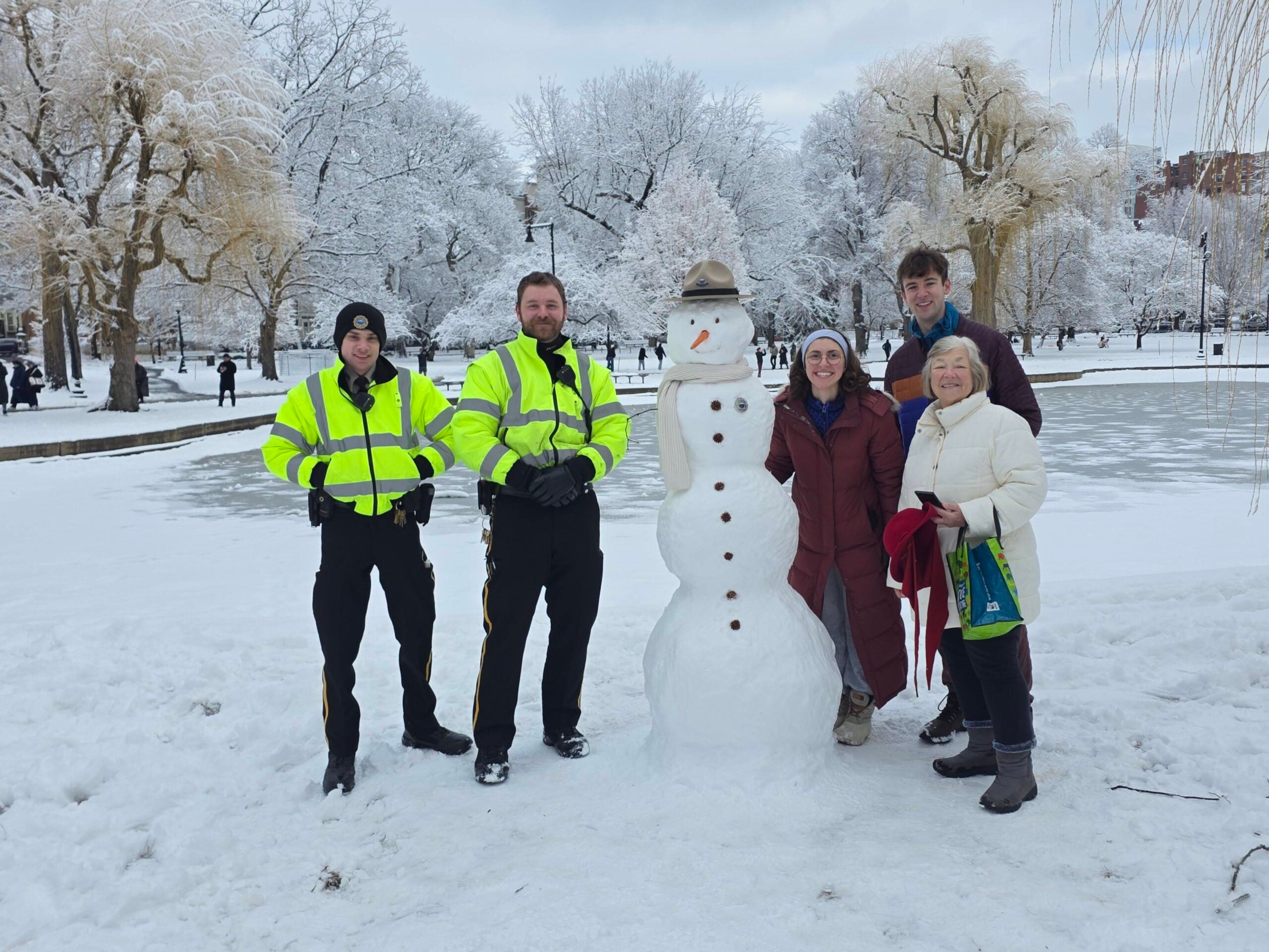 “My boyfriend and I got up early this morning to make a snowman in the public garden.” — Jaramie C. — Jaramie C. “Sneakers the dog with Sally the snowman.” — Jaramie C.“The park rangers who made a park ranger snowman.” — Jaramie C. “So many people stopped for a picture.” — Jaramie C.“We made a friend who donated her striking red hat and found chestnut balls for the buttons.” — Jaramie C.