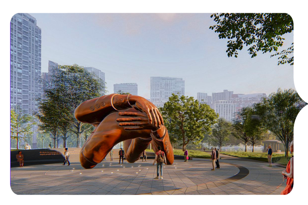 What is it? The Embrace Memorial is a 38,000 pound, 20-foot-high, 40-foot-wide bronze sculpture in the shape of the hug Dr. Martin Luther King Jr. shared with his wife, Coretta Scott King, after he won the Nobel Peace Prize in 1964. The memorial and Freedom Plaza were designed by world-renowned conceptual artist Hank Willis Thomas and global award-winning design firm MASS Design Group. The plaza also honors 69 local civil rights leaders.