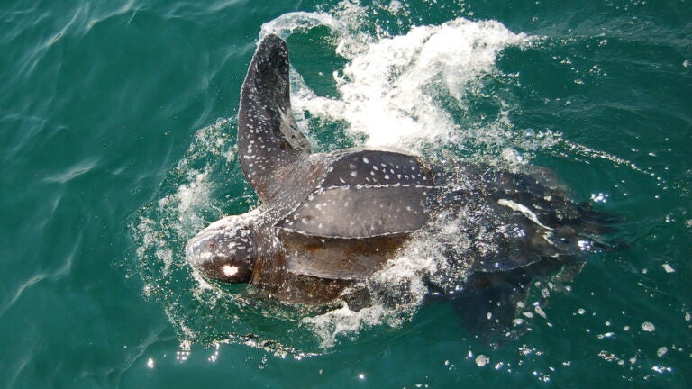 Prescott says leatherbacks are the largest of all sea turtles, and can weigh up to 2,000 pounds (907 kilograms).