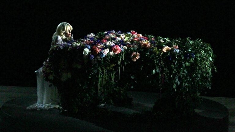 The pop star sang John Lennon’s classic “Imagine.’’ It did look like she was playing on the largest bouquet in the world, but her floral-adorned piano was the only Fame Monster’s mark.
