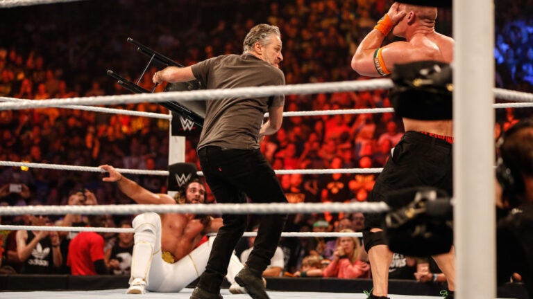Serving as a guest host for the show, Stewart couldn’t help himself from stepping inside the ring during the Champion vs. Champion match between Seth Rollins and West Newbury native John Cena.