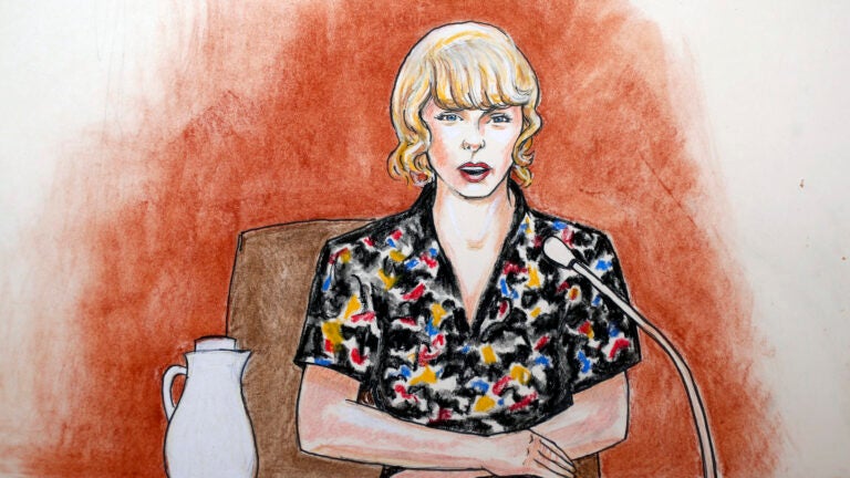 In the image shown to jurors during opening statements but not publicly released, Mueller’s hand is behind Swift, just below her waist. Both are smiling. Mueller’s then-girlfriend is standing on the other side of Swift.