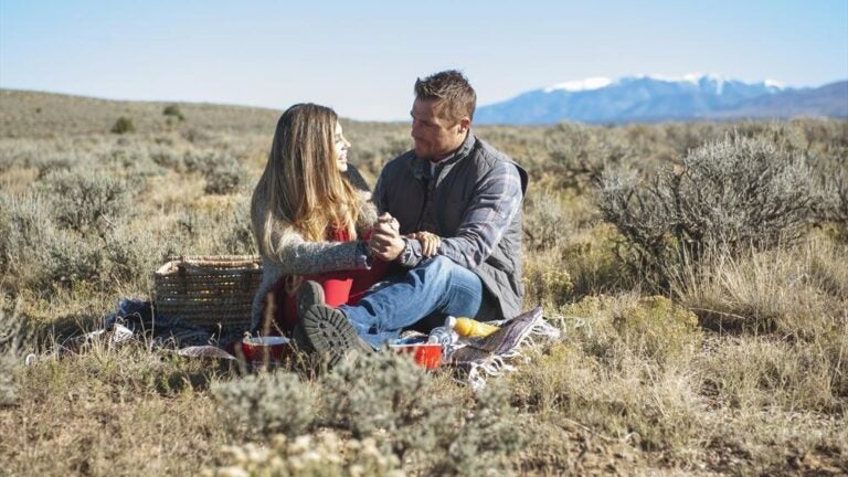 Their date is a hot air balloon ride over the stunning New Mexican countryside. But looking at the landscape below is not nearly as interesting to these two as looking into each other’s eyes and kissing. Hardly any time passes at all before Chris remembers everything he first liked so much about Princess Shinylocks.