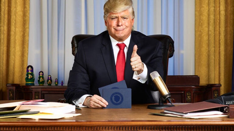 According to the twisted world of “The President Show,” Trump has decided to bypass the crooked, failing media by going directly to Americans with a late-night show aired from the Oval Office.