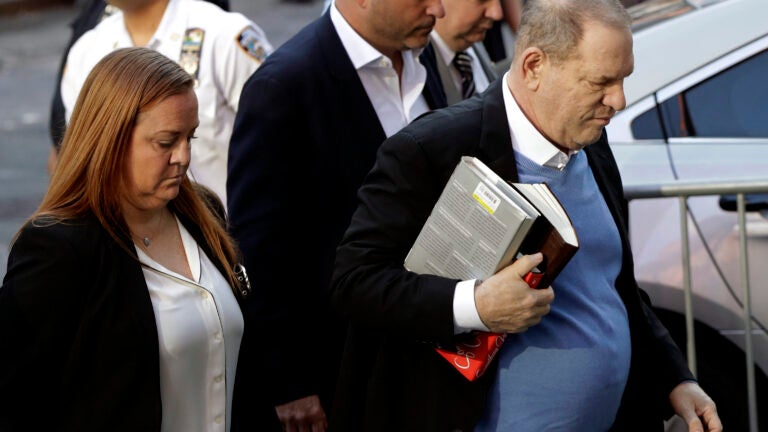 He didn’t respond to shouts of “Harvey!” as he lumbered into the police station, wearing a blazer and carrying books including “Something Wonderful: Rodgers and Hammerstein’s Broadway Revolution,” about the Broadway musical duo of Richard Rodgers and Oscar Hammerstein II, and “Elia Kazan,” about the famed film director,