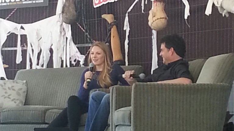 1:02 P.M. – Emma Bell (Amy) is the next actor to take the stage; she was the victim in one of the show’s most emotional moments, all the way back in its fourth episode. The much younger sister of Andrea (Laurie Holden), Amy was bitten and killed in an attack on the camp, leading to the tearful, zombie-preventing sort-of-execution by Andrea. One of the great moments in the show’s history. Bell, it turns out, was also in one of my favorite little guilty pleasures over the past few years, the stuck-on-a-ski-lift horror flick “Frozen’’ (no, definitely not the “Let it Go’’ movie), so maybe someone will ask about that.