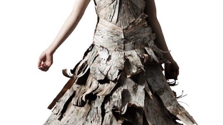 The stylish exhibit, now on display at Copley Place, features 36 garments, each crafted by fashion design students from the Massachusetts College of Art and Design undergraduate and fashion certificate programs. Dotted throughout the center court of the Copley mall are five platforms that showcase ensembles constructed with materials ranging from the traditionally luxurious (silk, chiffon, and lace) to quirky (tree bark and paper clips).