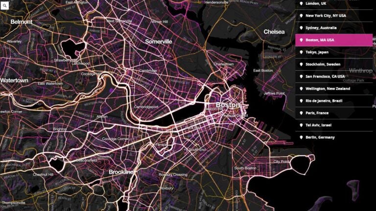 The Boston Marathon route from Hopkinton is also lit up with varying gradients of color, starting with white (more popular routes) along Commonwealth Ave. in Boston, and moving toward orange and yellow lines (designating 20 miles or more) in the view of roads closer to Hopkinton.
