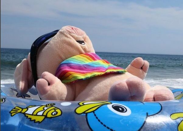 This plush pig is giving us summer envy.
