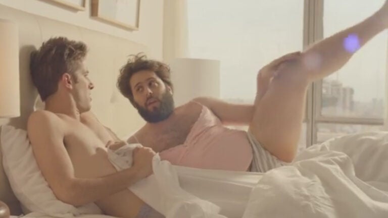 In one clip, a shirtless and notably hairless young man rolls over in his bed, discarded distinctly feminine clothing from his dalliance on the ground beside him, in a flawless luxury apartment with floor-to-ceiling windows. He then shrinks back in disgust after grasping the leg of the woman laying next to him. Why you ask? Because that’s not the model-smooth leg he anticipated!