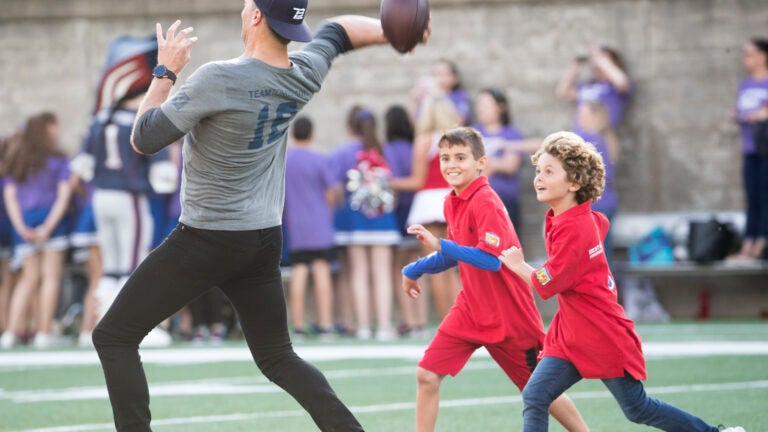 Friday, Brady was at Harvard Stadium to play in a flag football game benefiting Best Buddies. The all-in-good-fun game is the traditional kickoff for the Best Buddies Challenge, an annual fund-raiser that includes a 100-mile charity ride and walk benefiting Best Buddies International. (The ride and walk took place Saturday on the Cape.)