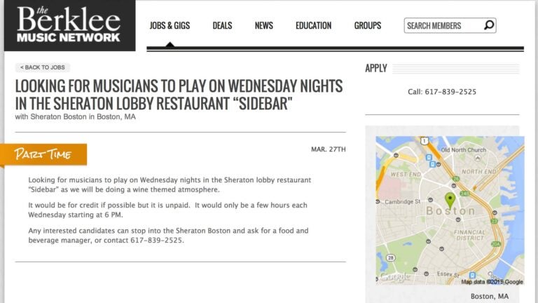 While he does see unpaid gigs listed on the Berklee boards from time to time, “there’s usually some sort of return, and it’s usually within reason,’’ he said. “Sheraton can definitely afford whatever they want, including high-quality entertainment.’’