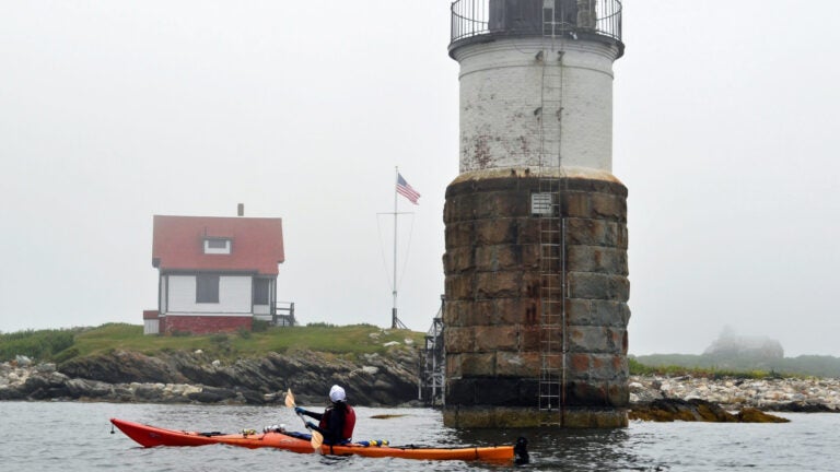 BOOTHBAY HARBOR Cat Cho of Sydney paddles around the Ram Island Lighthouse, built in 1883, on a Maine Kayak excursion.