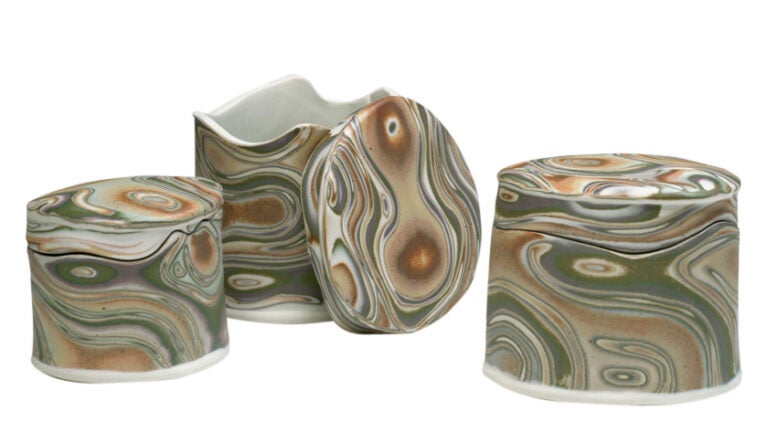 Some work is crafted by pinching, coiling, and working with slabs of clay. Other pieces are thrown on the pottery wheel and then carved. To make patterns that look like wood grain and other natural swirls, Lindenfeld layers colored clays — subdued blues, sage greens, smoky lavenders — and presses them into loaf-sized blocks. She then cuts off a slice and rolls it flat to create her collection of teapots, mugs, vases, lamps, platters, lidded jars, tiles, and her biggest selling item, decorative earring holders.