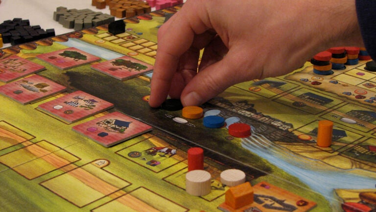 Inside the resort, a 130-room lakeside hotel about 20 minutes north of Dartmouth College, game boxes labeled Agricola, Belfort, and Caylus