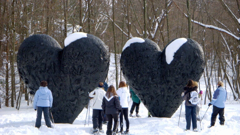 In the distance we saw a small group of children and adults snowshoeing across the hill, making tracks in the freshly fallen snow. Young children bounded ahead of the group as they made their way to Jim Dine’s “Two Big Black Hearts’’ sculpture. The giant bronze, all the more striking against the stark white backdrop, is one of about 65 sculptures on display at the deCordova’s 35-acre campus of lawns, forests, and fields along the shore of Flint’s Pond. The group moved in for a closer look to see casts of objects, like seashells and tools, and the handprints of the artist, imprinted on the hearts. Before long, they were on the move again, heading across the field for another close-up look at the next sculpture.