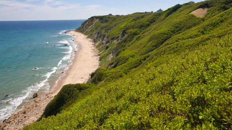 On the southern side of Cooneymus Road is Rodman’s Hollow, a half-mile-wide deep cleft in the land that goes right down to the sea. The white birches that once covered the island still grow here, sheltered from sharp winds and now a haven to deer and pheasant. A short loop on a nearby knoll rewards you with panoramic vistas of the surrounding hills, which are covered in white from budding shadbush in mid-May.