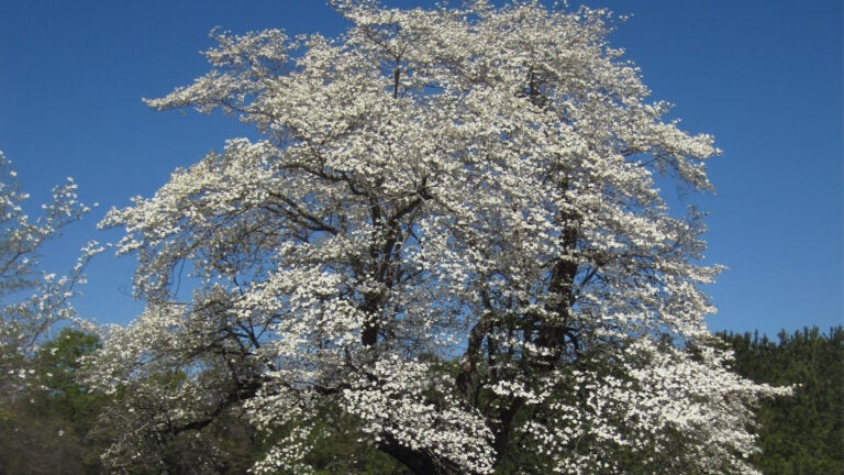 One of the largest dogwoods in the country, measuring 31 feet tall with an average branch spread of 48 feet and a trunk circumference of 114 inches, this tree heralds spring from Matthis Family Cemetery in Clinton.