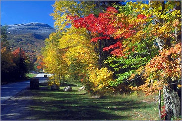 Directions: The Monadnock region of southern New Hampshire offers views of bright, colorful scenery around Mount Monadnock (right). Start your trip in Milford, enjoy Route 101 through Peterborough and into Dublin. Turn right to Harrisville, take Route 137 back to Peterborough and Route 101. To truly make your trip memorable, stretch your legs, get a different view of the foliage, and climb to the summit of Mount Monadnock.