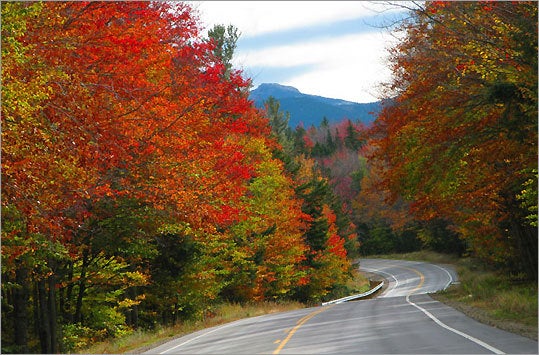 The high elevation of Sugar Hill provides early fall color with Franconia Notch as a backdrop.