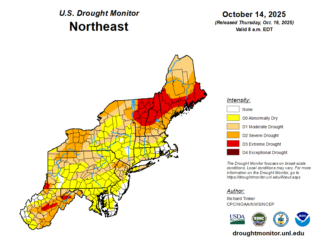 An updated map of drought conditions in the Northeast, which will impact 2025 fall foliage.