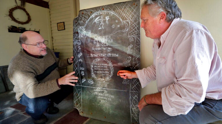 Walter Skold enlisted the son of novelist John Updike to carve a unique tombstone that will be topped with a dancing skeleton and a quill. Michael Updike, who received the poet’s deposit last month, said he never expected to be carving the monument so soon.