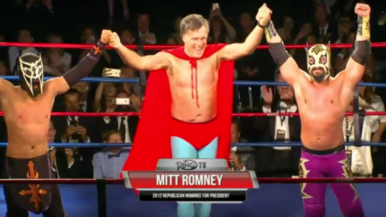 Romney had a rough-and-tumble time with two other luchadores, throwing two pretty soft clotheslines before being unmasked.