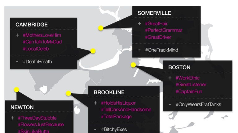 Notably absent from the map are Allston, Brighton, and South Boston, which may have given a broader sense of the younger demographic the app typically goes after. In the one-sheet sent over by Lulu, they note that the outcomes aren’t necessarily the most-used, but the “outliers in each town — or the hashtags that are more frequently used in one area than the other four.’’