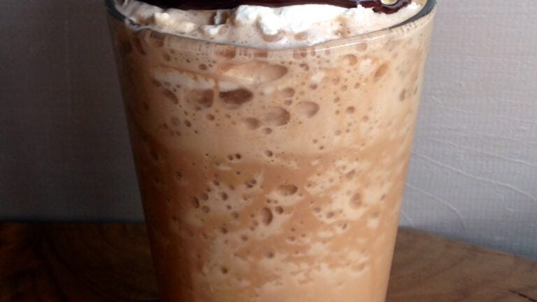 A frappuccino by any other name would taste as good—and this one sure does. It starts with roastmaster Patrick Maloney’s espresso, roasted in the company’s Hopedale facility. Sugar is added, then 2 percent. The mixture is put through a Taylor machine to give it its icy slushiness that’ll give you an ice cream headache if you don’t slow down on the slurping.