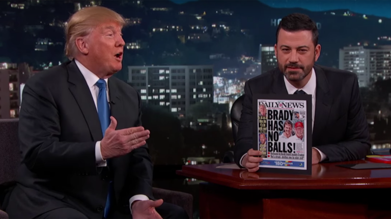 During Trump’s appearance Wednesday on Jimmy Kimmel Live!, Kimmel had a copy of The Daily News’s December 16 cover that blares the headline, “Brady Has No Balls!’’ The story pertains to Brady saying earlier this week on WEEI’s “Dennis and Callahan Show’’ that “Donald is a good friend’’ of his and Brady “supports’’ all of his friends.