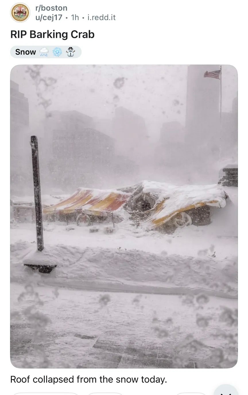 In a separate Instagram post, the Barking Crab team said they remained closed Tuesday to clean up following the blizzard. Many businesses, schools, and roads remain closed as the region digs itself out of two to three feet of snow.