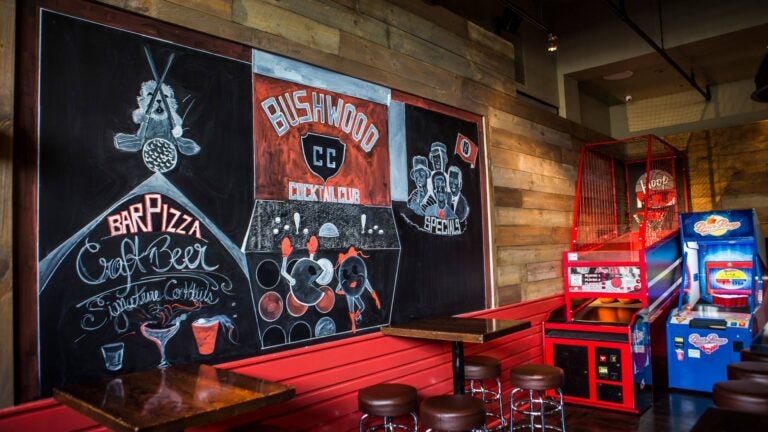 The 50-seat bar offers arcade and board games like Pac-Man and Rock ‘Em Sock ‘Em Robots, as well as retro music and décor from the ’70s, ’80s, and ’90s. Smith said that Bushwood’s overall atmosphere “hearkens back to the fun in those eras.”