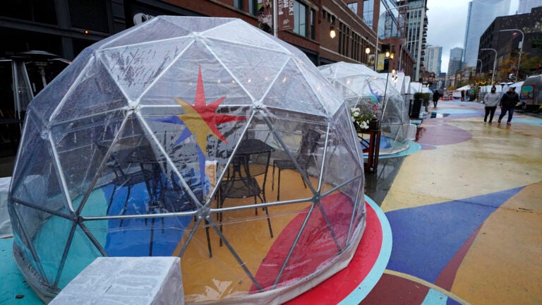 In Seattle, a local restaurant owner told KING-TV he spent thousands of dollars installing two large plastic domes outside his eatery that would hold one table each. Similar enclosures now line the streets of Chicago’s Fulton Market and Randolph Restaurant Row area, Eater Chicago reported, noting that the structures are made out of a material that traps heat and have controls to regulate airflow. Tent-style bubbles also have been spotted in New York City; a recent viral video showed groups of diners clustered closely around candlelit tables in individual plastic pods on the sidewalk.