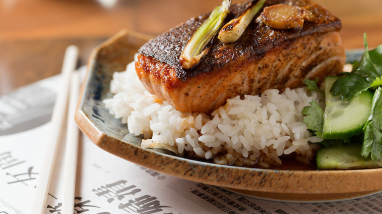 “This is the dish that started the restaurant!” exclaims Chang, adding that it’s her favorite dish by far. The salmon is pan roasted and glazed with soy, sugar, rice wine vinegar, sambal chili and lots of ginger. It’s topped with charred scallions and cilantro and a pickled cucumber salad and served on white rice. “I used to make this for Christopher when we were dating and he fell in love with it. ‘Why can’t you get a dish like this in Chinese restaurants?’ he would ask me. We decided to open our own so we could feature this and other dishes that we both loved.”