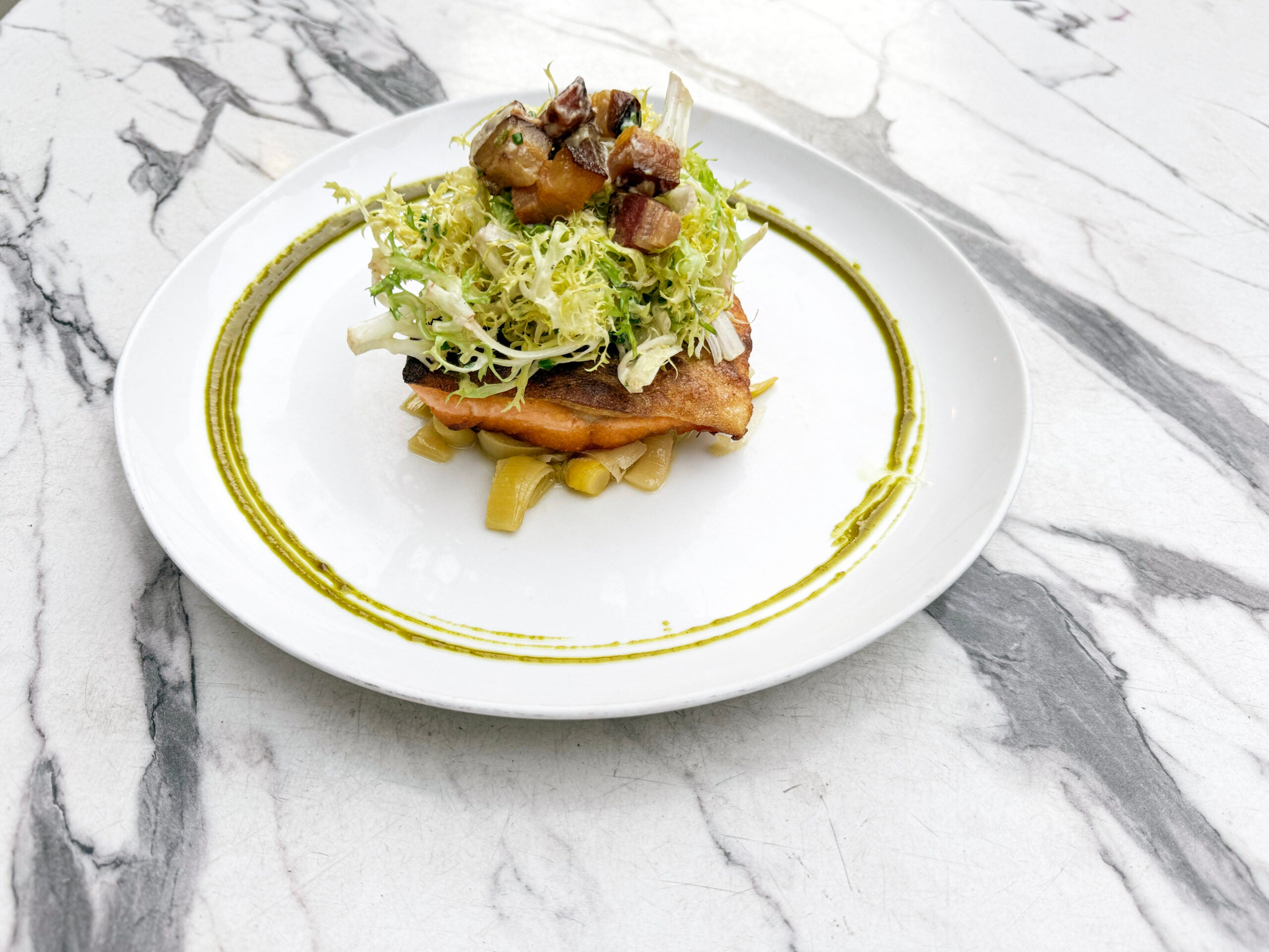 When Serpa and his team attempted to change the prep for this crispy skinned filet, “regulars were up in arms,” he recalls. The Arctic char is lightly cooked to medium rare and served with melted leeks cooked down with butter and white wine that “add a luxurious richness,” says Serpa. “The bright frisée and smoked bacon salad is dressed with a lemon-Dijon dressing and helps keep the dish in balance. A pistachio puree adds a little touch of nuttiness to round it out.”