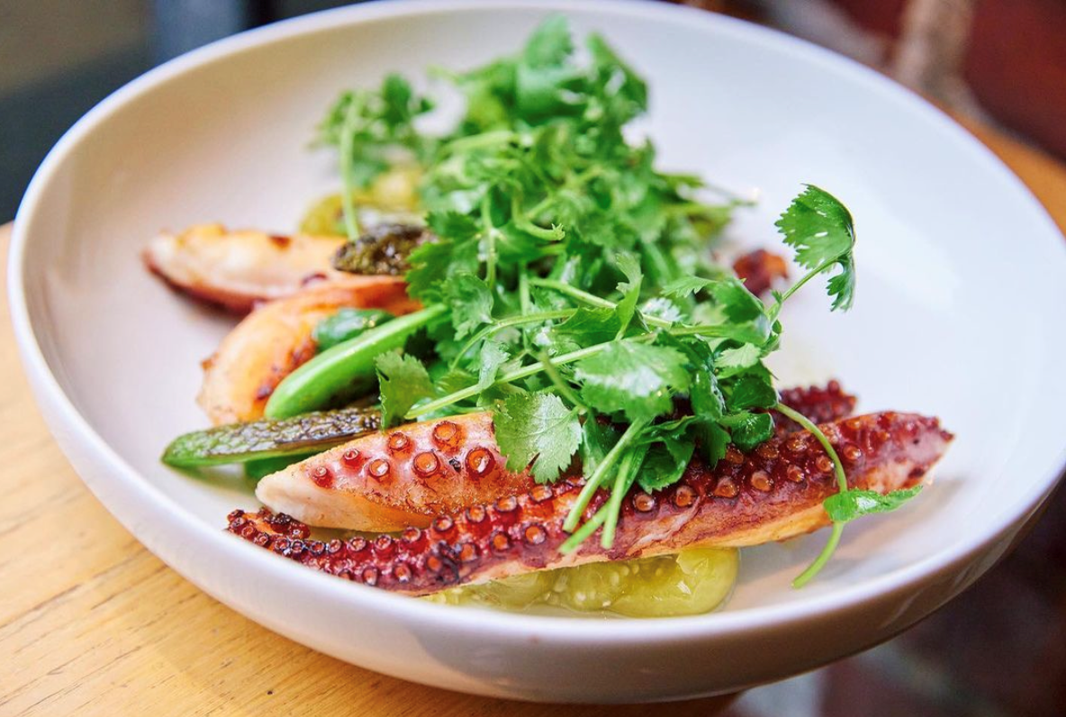 This Spanish octopus from Galicia is slow cooked and seared in a black steel pan with blistered snap peas and scallions. It’s another longtime standout, advises Serpa. “The dish has great contrast with roasted tomatillos that are served chilled, the hot seared octopus and a slightly warmed salad of cilantro dressed with a tomatillo salsa verde.”