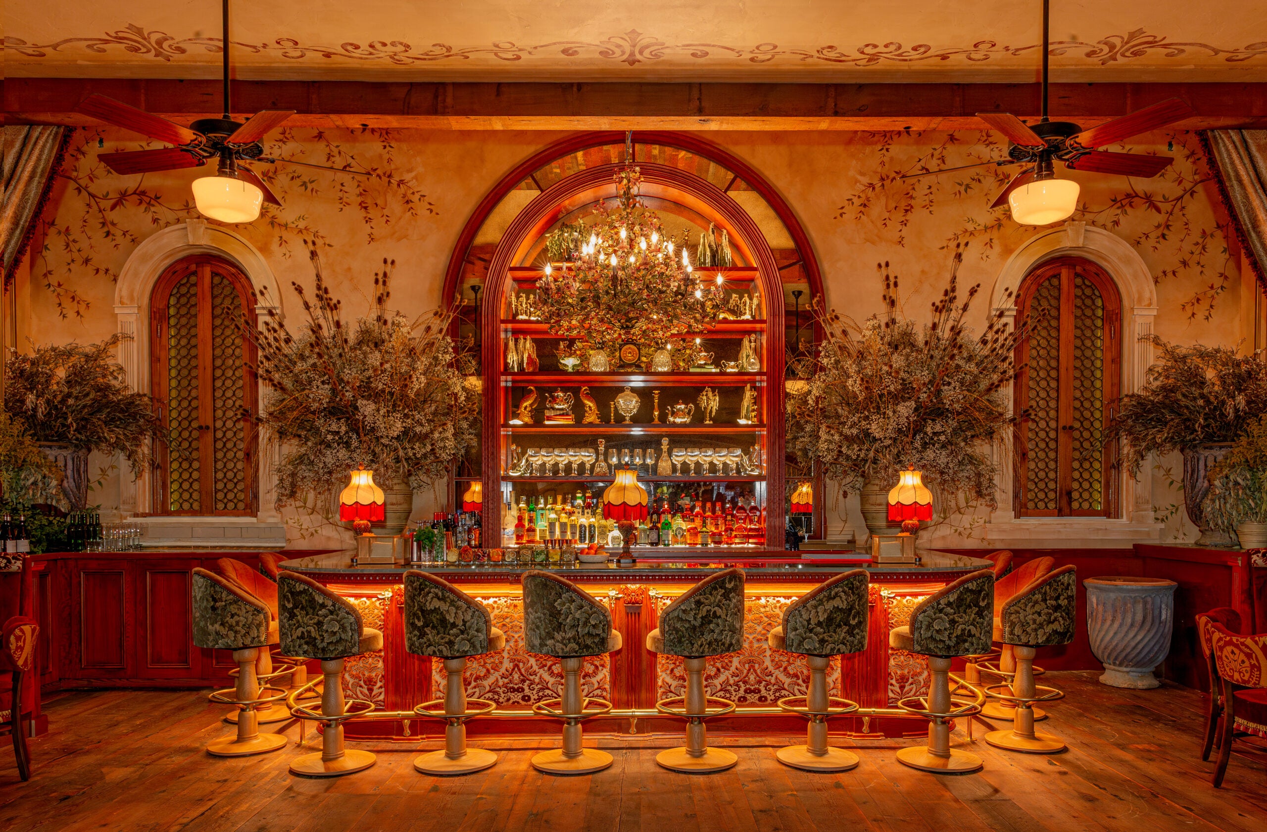 Guests can watch their meal prepared in a row of multiple seats that line an open window into the kitchen. Or they can squeeze into a red, velvet banquet, grab a table in the Spanish-tiled dining room under a glass skylight, or take a stool at one of the restaurant’s three bars.
