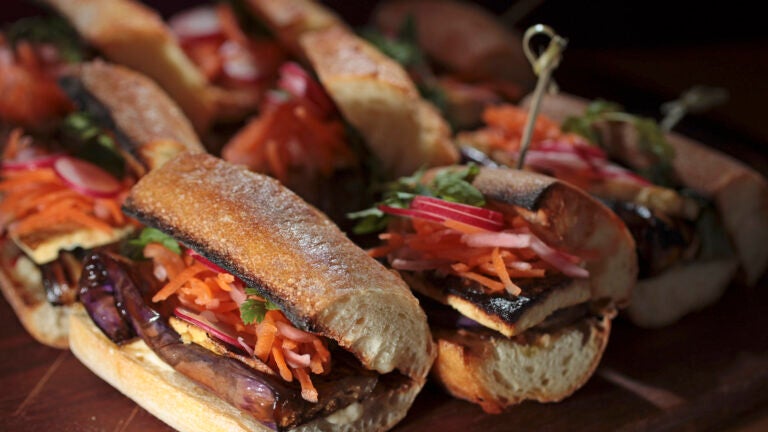 Tim Maslow, chef and co-owner of Strip T’s in Watertown, says to use firm, narrow, or elongated eggplant for this recipe. “Braising the vegetable,’’ says the chef, “takes ordinary roasted eggplant up a few notches.’’ The dish is a riff on the popular Vietnamese sandwich and includes pan-fried tofu, homemade pickled vegetables, and cilantro.
