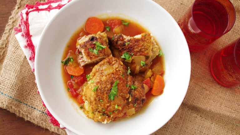 5. Cover and transfer to the oven. Cook for 30 minutes or until the chicken is cooked through. Reserve 4 chicken thighs for the soup. Transfer the remaining chicken to a platter. Sprinkle with parsley. Serve over couscous or rice. Molly Kravitz
