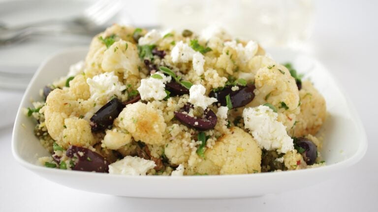 Cauliflower, roasted with garlic and crushed red pepper, lends a bold, nutty flavor here to couscous. Stir in the tastes of the Mediterranean — olives, capers, feta, and oregano — to make this simple dish pop. Serve it as a light, meatless meal or pair it with roast chicken or broiled fish.