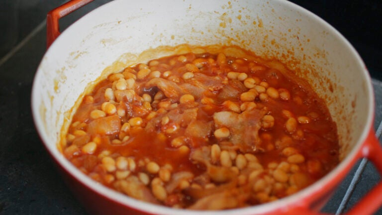 Make these baked beans with small white canned beans, bacon, and seasonings. The flavor is light, not cloyingly sweet or over-sauced like commercial canned beans, where sugar is often a main ingredient. Instead of the traditional salt pork, use strips of smoky uncured bacon. Set a cast-iron pot on your stove or over a fire’s embers.