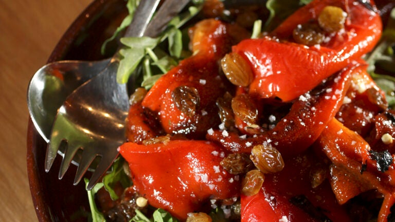 Sweet red peppers get even sweeter when cooked over embers in the fireplace, something like roasting them on an outdoor grill. Peel the peppers after they are cooked and mix with balsamic vinegar and golden raisins to make agrodolce flavors, the classic Italian sweet and sour mixture. Serve over arugula.