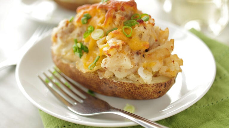 6. Brush the skins of each potato with some of the remaining vegetable oil. Set on a baking sheet. Divide the sausage mixture among the potatoes and top with the remaining cheddar.