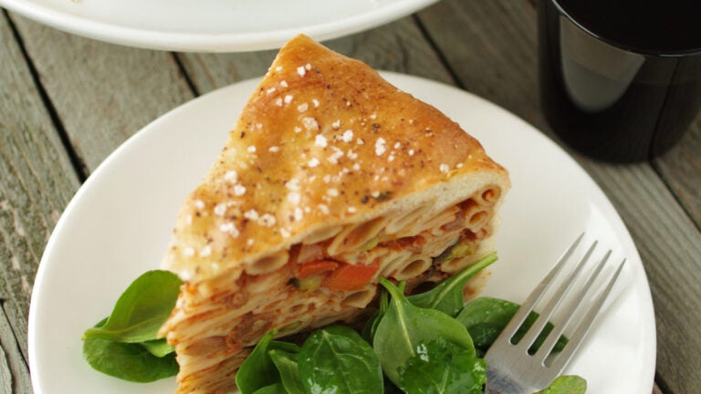 4. Brush the timbale with the egg mixture. Set it on a baking sheet. Bake the timbale for 1 hour or until the dough is puffed and golden. Let the dish settle for 5 minutes. Unlatch the sides of the springform and lift it off. Cut the timbale into wedges and serve with a green salad. Molly Kravitz