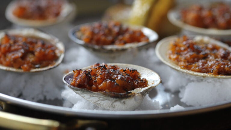 in Winchester, where he lives, and he re-creates several of those restaurants’ dishes: salt-roasted Maine clams, served in the shell with breadcrumbs, bits of chorizo, and an oregano mojo sauce, brought to meaty, briny bliss with a squeeze of seared lemon; and Mt. Desert Island mussels plumped with the flavors of smoked tomato and chorizo (Parsons is clearly a fan) in a decadent lobster broth.
