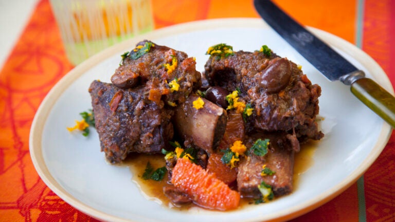 Because the cuts tend to be fatty, plan to cook them one day and serve them the next, so you can discard the fat on the liquid. Allow several hours for them to turn tender in a slow oven, while it warms the kitchen and everyone within a block of your house can smell what you’re up to. Freeze scraps of meat and some cooking juices and use them to flavor lentil or white-bean soup on another night. Frugal cooks are self-righteous cooks. You earned it.